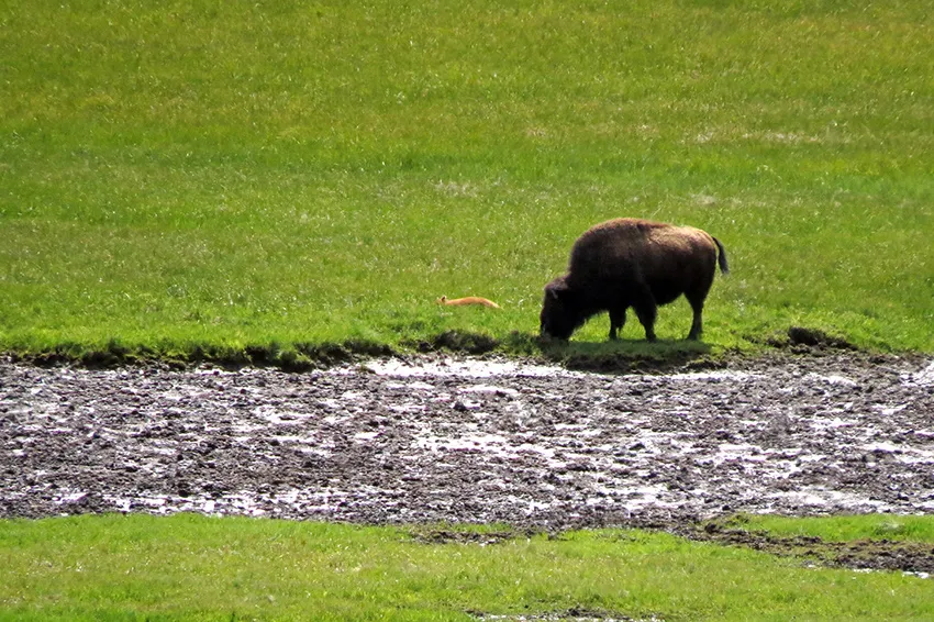 bison 옆으로 여우처럼 생긴 동물이 보이는데...어린 들소일 수도 있고... 하튼 좋은 줌렌즈가 있으면 좋았을텐데 말입니다... 쌍안경도 챙겨와야 했는데... 여하튼 동물들을 볼 때마다 너무 귀엽습니다. ^^ 옐로스톤 다큐멘터리를 미리 보고 왔는데 실제로는 동물들에게 가까이 다가갈 수 없는 점이 아쉽기도 하죠. bison 이 느릿하고 순해보이긴 하지만 몸집이 거대하고 마음만 먹으면 얘네들도 엄청 빠르다는...... 얼마전 뉴스에 bison 바로 몇 피트 앞에서 사진을 찍거나 구경하다가 bison 이 머리로 들이박으면서 사람이 날라가는 사건도 있었다고 하니 절대로 야생동물들에게 가까이 다가가서는 안될 듯합니다. 옐로스톤 정보지에 실린 주의사항에도 사람이 날라가는 삽화가 들어가있는데 그럴만한 이유가 있는 것이죠. 또 곰이 갑자기 가까이 다가올 땐 등을 보이고 달려가면 절대 안되고 한 군데에 다 같이 모여서 곰이 지나가게끔 기다려줘야 한다는군요.